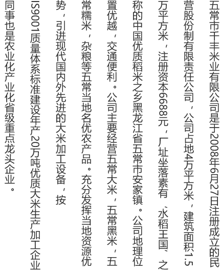 五常市千豐米業(yè)有限公司是于2008年6月27日注冊(cè)成立的民營(yíng)股份制有限責(zé)任公司